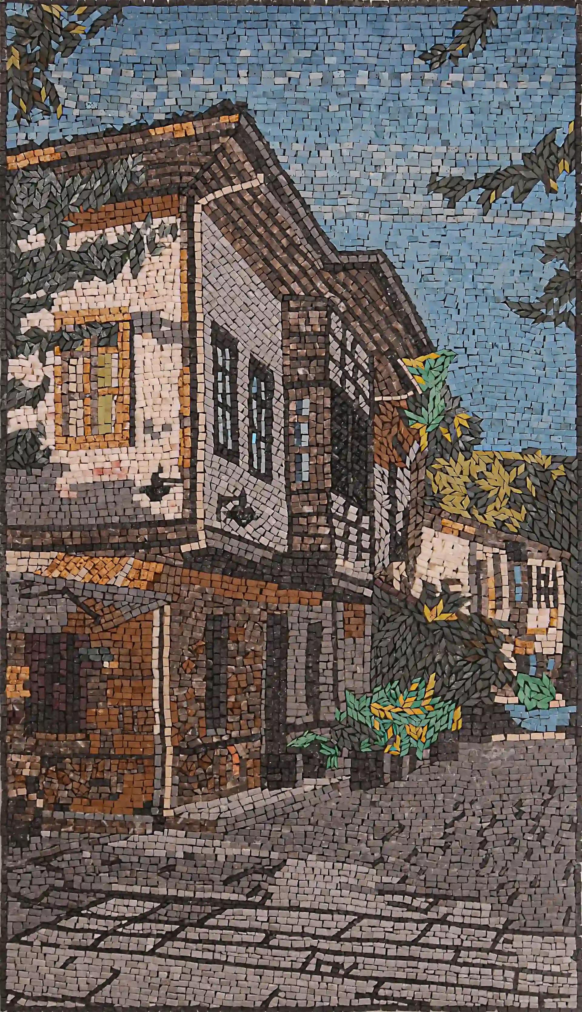 Exquisite Handcrafted Mosaic Artwork Depicting Old Street Scene